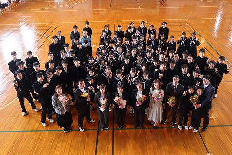 代表生徒が、これまでの感謝の気持ちを込めた言葉を伝え、一人ひとりに花束を贈りました。生徒たちの言葉を受け、涙ぐむ先生方の姿も見られました。式の最後には、先生方との記念写真を撮影しました。畑野中学校での思い出を大切に、先生方の新たな門出を心からお祝いしたいと思います。これまで本校の教育活動にご尽力いただいた先生方に、改めて感謝申し上げるとともに、今後のご健康とご活躍を心よりお祈りいたします。